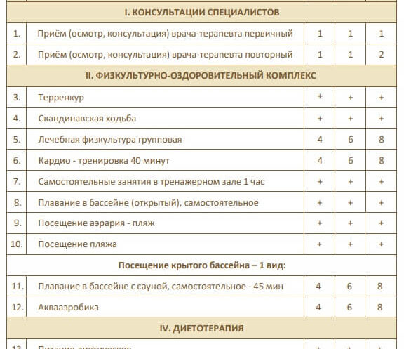 Перечень и количество процедур по программе Оздоровление Стандарт
