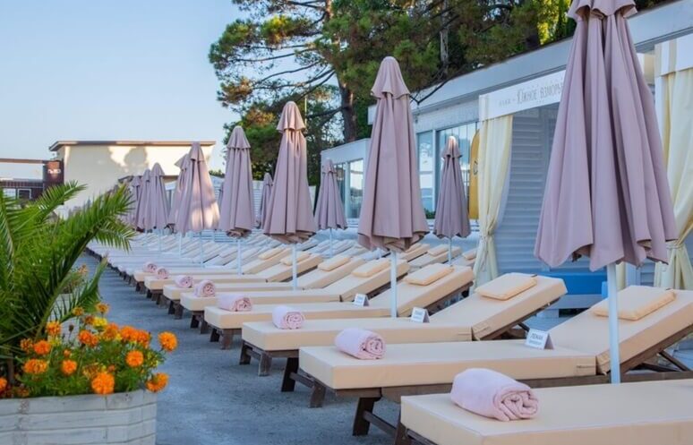 Роскошный пляжный комплекс длиной более 380 метров предлагает шезлонги, зонты, душевые, раздевалки, удобства для людей с ограниченными возможностями, медпункт и спасателей. На набережной находится двухуровневый ресторанный комплекс Bellini с открытой террасой. В Bellini Bar подают коктейли, соки, блюда средиземноморской кухни, пиццу, закуски и десерты, а также проводят концерты и караоке. По территории курсируют электрокары.